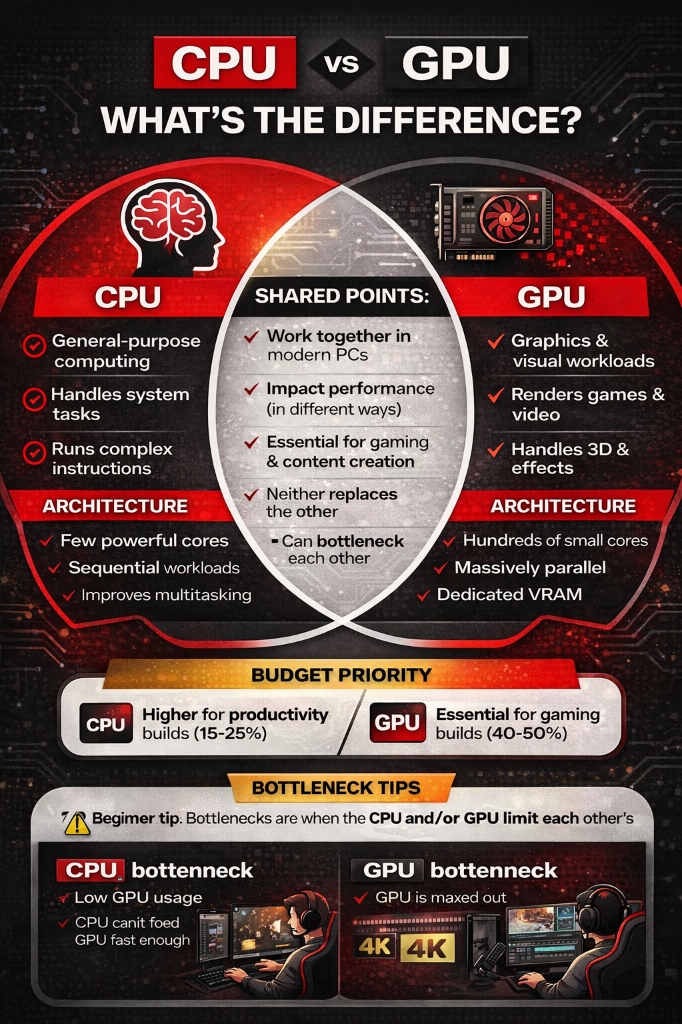 If you're building your first PC, you've probably heard a lot about CPUs and GPUs. These are two of the most important components in your computer, but they do very different jobs. Let's break down what each one does in a way that actually makes sense.